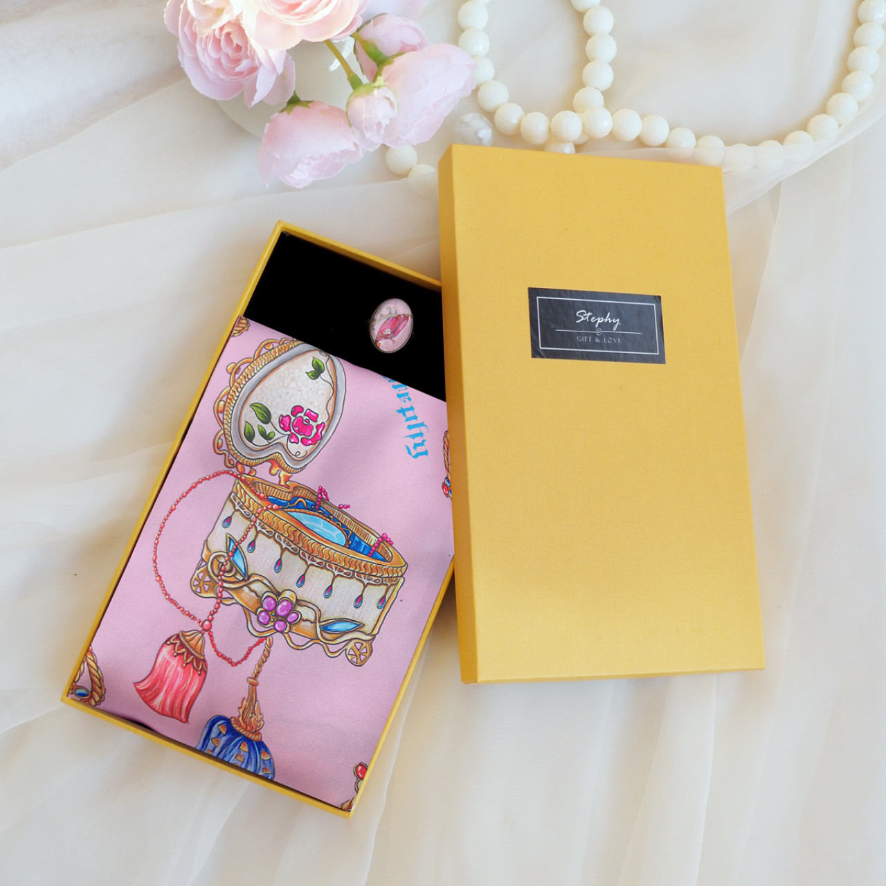 每個禮物盒都是美麗精心手工包裝, 內有一條絲滑方巾配搭一個同圖插畫絲巾扣