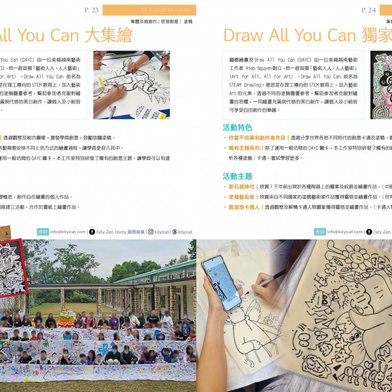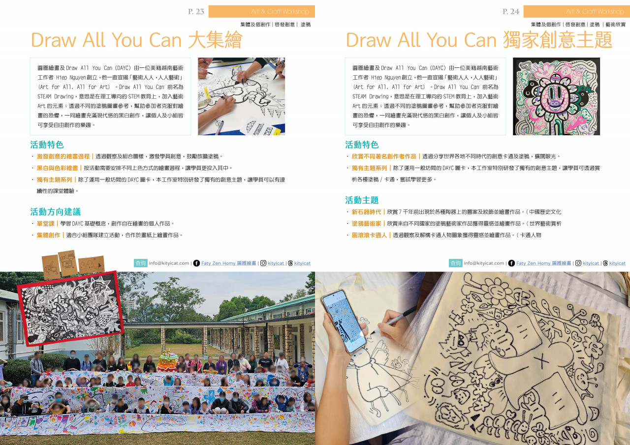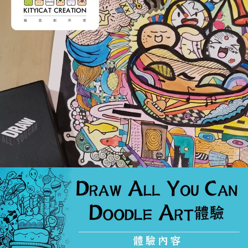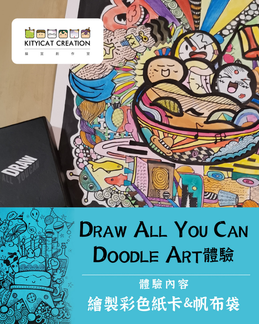 • 由本地插畫師及創意藝術導師Cat Kwan教授,介紹來自美籍藝術家建立的Draw All You Can繪畫方式,嘗試透過觀察和聯想創作出獨一無二又充滿童趣的塗鴉作品。(課堂可完成紙卡及TOTEBAG)